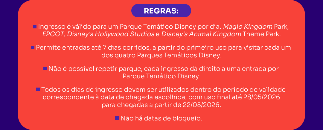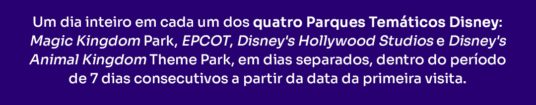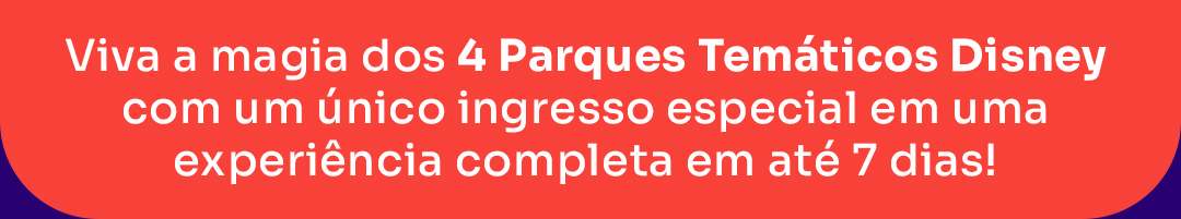 Importante: Promoção 10%OFF válida para novas reservas de 10 a 30 de setembro de 2025 (ou enquanto durarem os ingressos). Desconto de 10% concedido no ato da reserva. Aplique o cupom MAGIANAQBY. Não cumulativo com outras promoções ativas. Promoção 4 PARK MAGIC é válido para reservas de 10 de setembro a 15 de maio de 2026. Entradas de 04 de janeiro a 22 de maio de 2026 (ou enquanto durarem os ingressos). ©2025 Disney. Todos os direitos reservados.